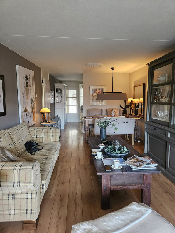 The living room is richly furnished with a diversity of furniture pieces and accessories, mainly in a classic country style. Tasteful accessories, including floral arrangements, vases, sculptures, table lamps, a mirror, and paintings, all on itself contributing to a warm and atmospheric ambiance.