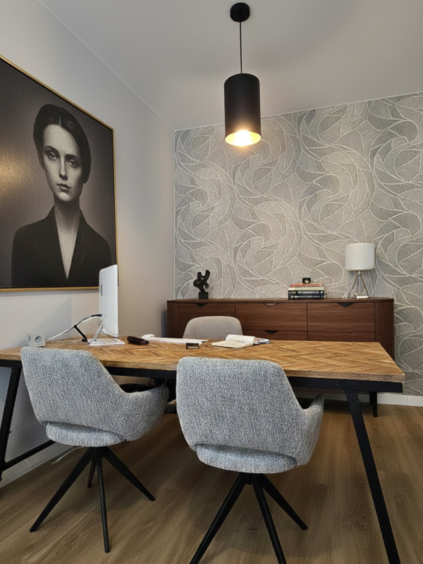 Based on evolving insights she decides she needed a larger desk with chairs for visitors, which led her to forgo the proposed sofa to make room for this adjustment. And finally she requested a different wallpaper than the one originally proposed. Together, we explored alternatives that complemented the design while being less prominent.